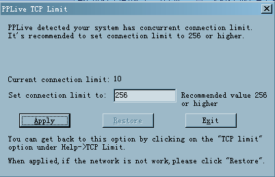 インストール終了が終わり、PPLiveが起動されると初めにこんなウインドウが出てきて、最大接続数を変えるかって聞いてきます。僕の場合、変えても変えなくても大した変化が見られませんでした。