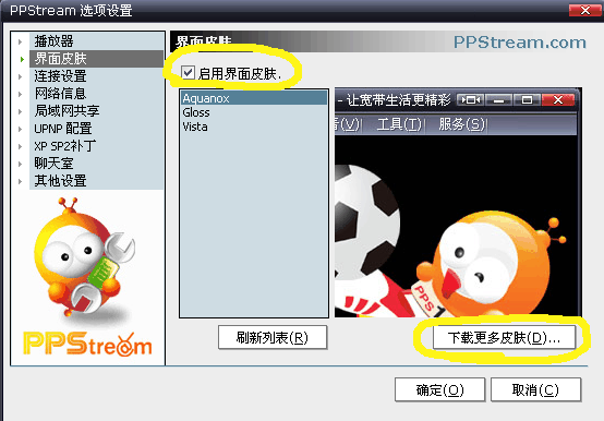 「PPstream」はスキンにも対応していて、「工具」→「选项」→「界面皮肤」とたどっていったところで変更できます。